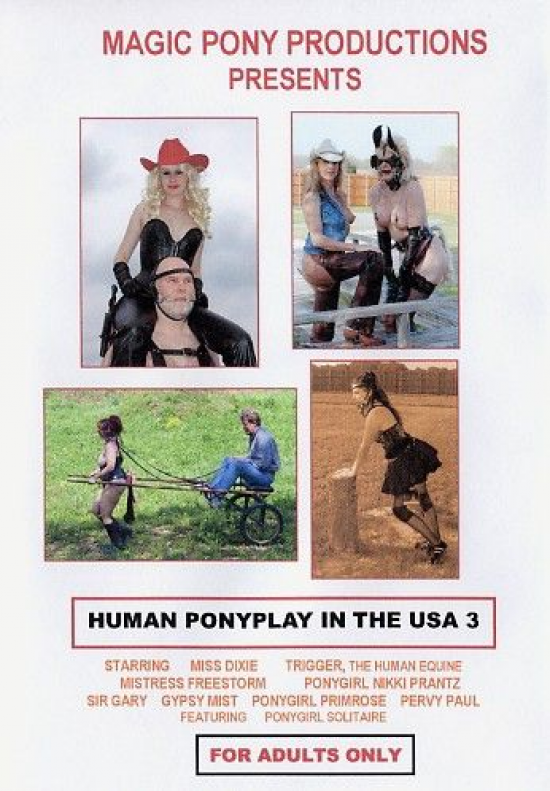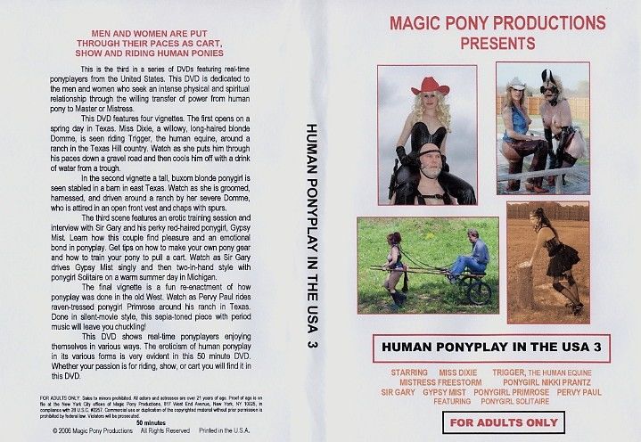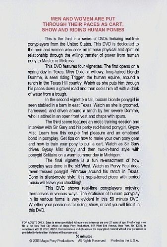 This is the third in a series of DVD's featuring real-time ponyplayers from the USA. This DVD is dedicated to the men and women who seek an intense physical and spiritual relationship through the willing transfer of power from human pony to Master or Mistress. This DVD features four vignettes. The first opens on a spring day in Texas. Miss Dixie, a willowy, long-haired blonde Domme, is seen riding Trigger, the human equine, around a ranch in the Texas Hill country. Watch as she puts him through his paces down a gravel road and then cools him off with a xXx of water from a trough. In the second vignette a tall, buxom blonde ponygirl is seen stabled in a barn in east Texas. Watch as she is groomed, harnessed, and driven around a ranch by her severe Domme, who is attined in an open front vest and chaps with spurs. The third scene features an erotic training session and interview with Sir Gary and his perky red-haired ponygirl, Gypsy Mist. Learn how this couple find pleasure and an emotional bond in ponyplay. Get tips on how to make your own pony gear and how to train your pony to pull a cart. Watch as Sir Gary drives Gypsy Mist singly and then two-in-hand style with ponygirl Solitaire on a warm summer day in Michigan. The final vignette is a fun re-enactment of how ponyplay was done in the old West. Watch as Pervy Paul rides raven-tressed ponygirl Primrose around his ranch in Texas. Done in silent-movie style. this sepia-toned piece with period music will leave you chuckling! This DVD shows real-time ponyplayers enjoying themselves in various ways. The eroticism of human ponyplay in it's various forms is very evident in this 50 minutes DVD. Wheiter your passion is for riding, show, or cart you will find it in this DVD.