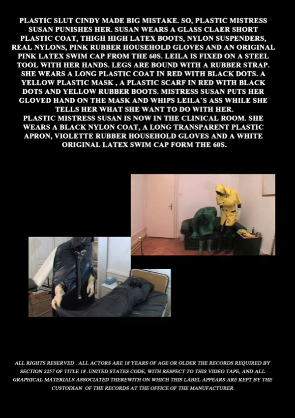 Rubber slut Cindy made a big mistake and is getting punished for it. Susan wears claer shorts, plastic coat, Tigh High Latex Boots, Nylon Suspenders, Real Nylons and pink rubber household gloves. Cindy is getting bound to the bed with leather straps and Susan rubs her sexy pussy with her gloves and tells her what terrible things she is going to do to Cindy to punish her.